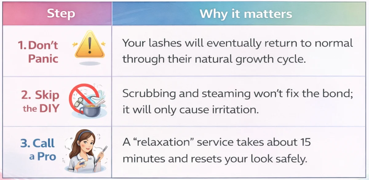 When panic sets in, it’s tempting to try common online advice. You might see suggestions to un-curl lash extensions (though extensions are usually removed, not un-curled) or lifts using: