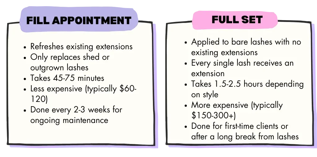 Think of it this way: a full set is like painting an entire room, while a fill is touching up the spots that need attention. Both result in beautiful lashes, but fills are more efficient when you already have a good foundation.