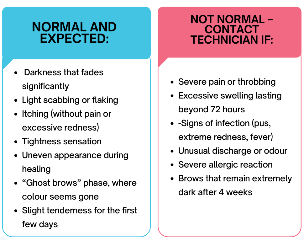 - Brows may feel dry or rough during healing. Keep them moisturised with approved aftercare products.